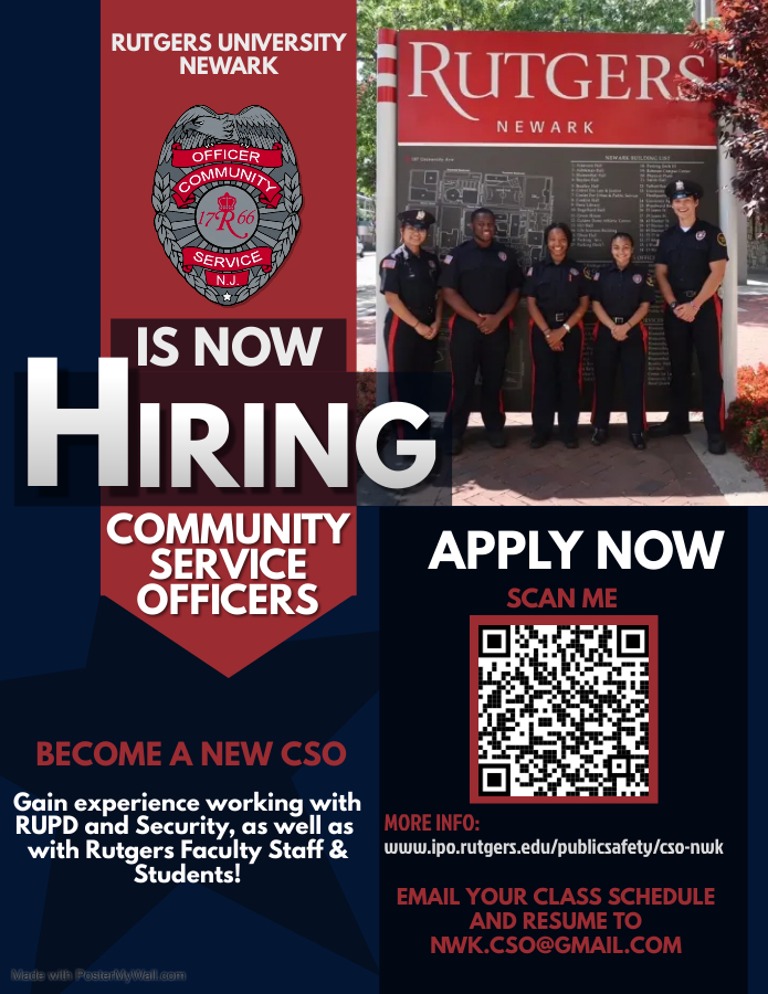 Community Service Officers (CSOs) are full-time students who are uniformed, unarmed paid employees of the RUPD. Many of them go on to careers in law enforcement or public service. All CSO's receive 40 hours of formal training through the New Jersey College and University Public Safety Association prior to the assignment of duties.